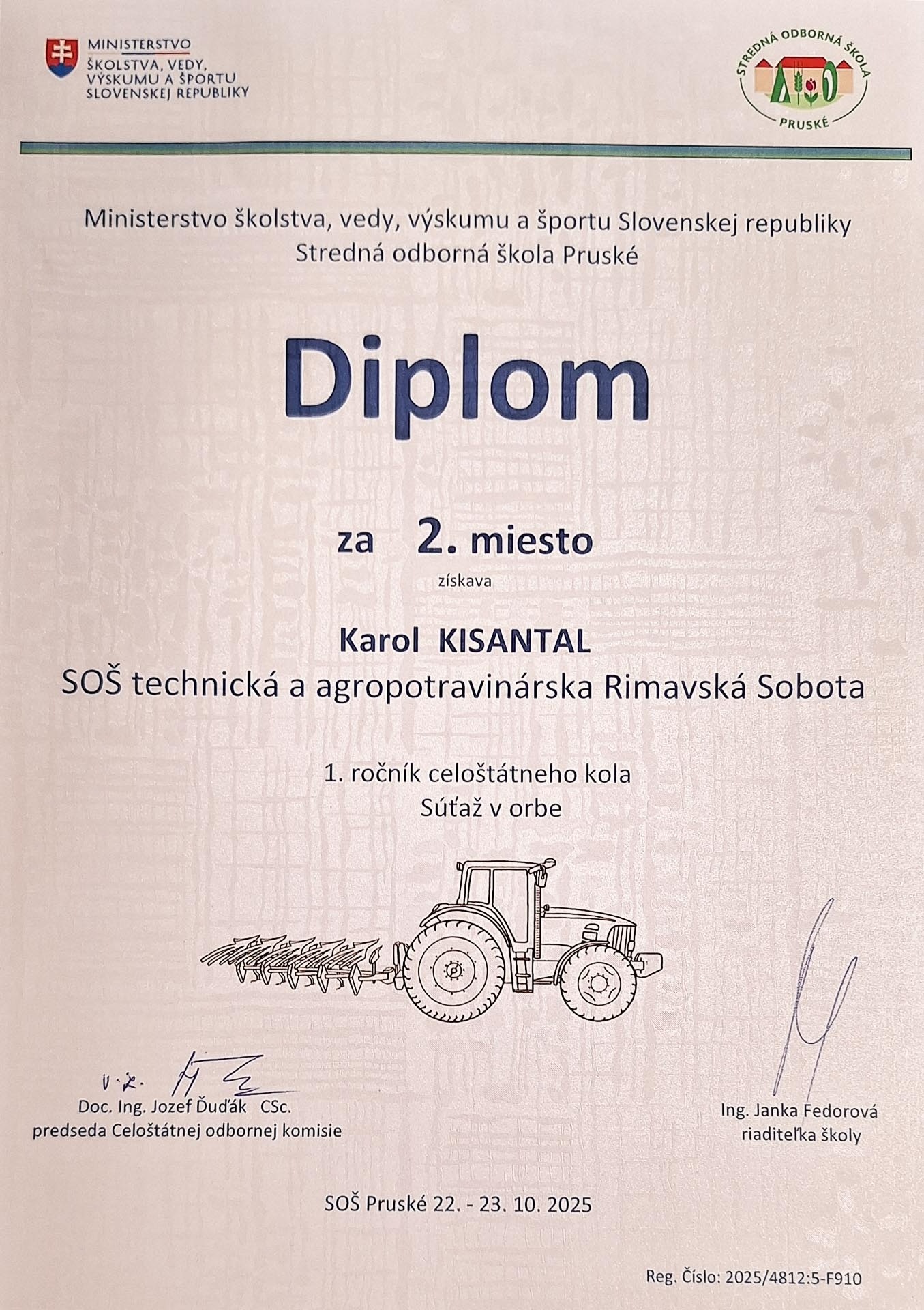 V Pruskom sa v dňoch 22. – 23. októbra 2025 konal 1. ročník celoštátnej súťaže v orbe, ktorého cieľom bolo podporiť záujem žiakov o poľnohospodárstvo, prácu s pôdou a moderné agrotechnické postupy. Podujatie organizovala Stredná odborná škola Pruské v spolupráci so spoločnosťou AgroDulov s.r.o. a združením AGRION. Našu školu SOŠ technickú a agropotravinársku reprezentoval Karol Kisantal, žiak 4. ročníka odboru agromechatronik. Súťaž odštartovala teoretickým testom, ktorý bol zameraný na problematiku orby. Po ňom nasledoval oficiálny tréning orby na pozemkoch AgroDulov, Druhý deň 1. ročníka celoštátnej súťaže v orbe, ktorý sa konal v areáli SOŠ Pruské a na súťažných pozemkoch AgroDulov, priniesol nielen napätie, vôňu pôdy a zvuk traktorov, ale aj radosť a úspech pre našu školu. Karol Kisantal získal nádherné druhé miesto v silnej konkurencii súťažiacich zo Slovenska aj z Českej republiky! Súťažný deň sa začal slávnostným sľubom oráčov a rozhodcov, po ktorom nasledovala ostrá súťažná orba. Účastníci predviedli svoje zručnosti v práci s dvojradličným pluhom, precíznosť, presnosť a cit pre pôdu, ktoré sú pre kvalitnú orbu nevyhnutné. Rozhodcovia hodnotili výkony podľa medzinárodného bodovacieho systému používaného na majstrovstvách sveta v orbe, takže posudzovanie bolo prísne. Poobede prebehlo vyhlásenie výsledkov a odovzdanie cien, kde si výhercovia prevzali poháre, diplomy, vecné aj finančné ceny. Na všetkých účastníkov čakala aj milá pozornosť – certifikáty za účasť, ktoré im budú pripomínať túto výnimočnú skúsenosť. Celú atmosféru sprevádzala radosť, uznanie a zaslúžený potlesk pre všetkých súťažiacich. Veľká vďaka patrí organizátorom súťaže – Strednej odbornej škole Pruské, pretože pripravili podujatie na vysokej úrovni. Vďaka nim sme získali cenné skúsenosti, nové poznatky aj množstvo príjemných zážitkov. Karolovi srdečne blahoželáme k výbornému výsledku a ďakujeme mu za vzornú reprezentáciu našej školy. Svojím prístupom, zručnosťou a pokojom za volantom traktora potvrdil, že poctivá práca a záujem o odbor prinášajú skvelé výsledky.
