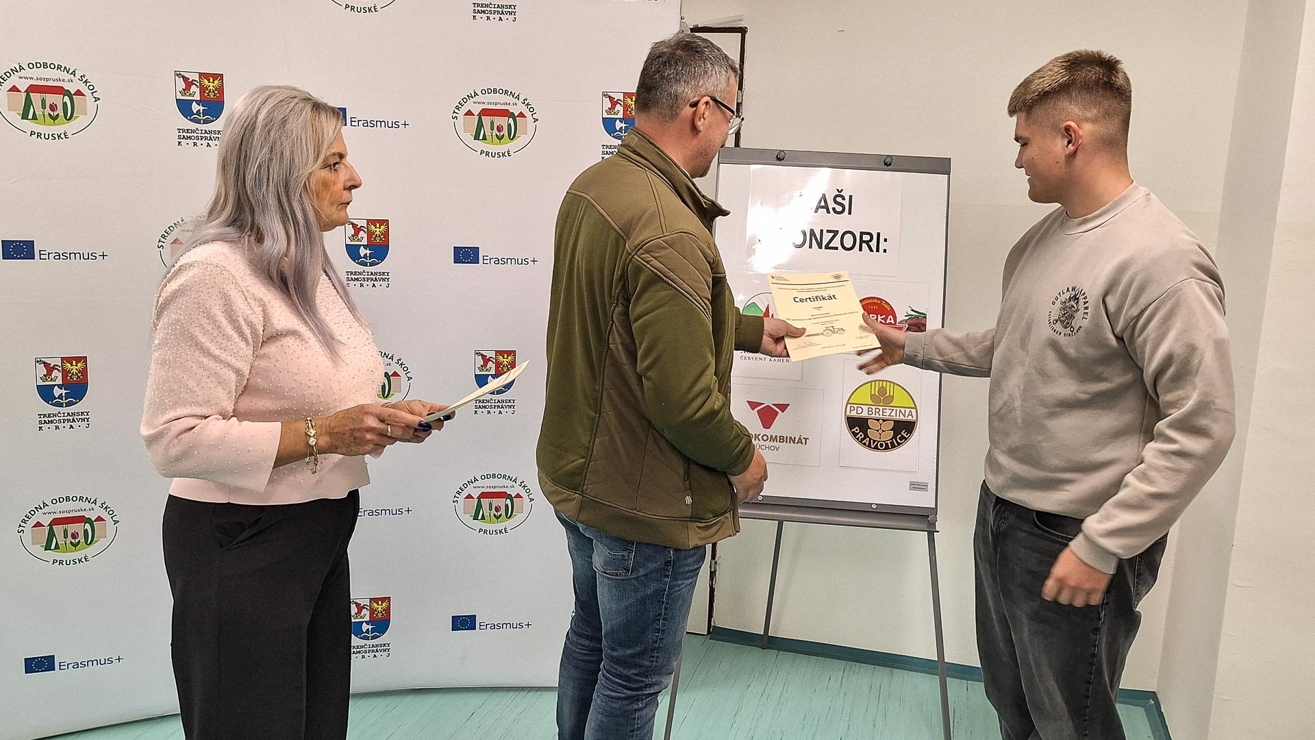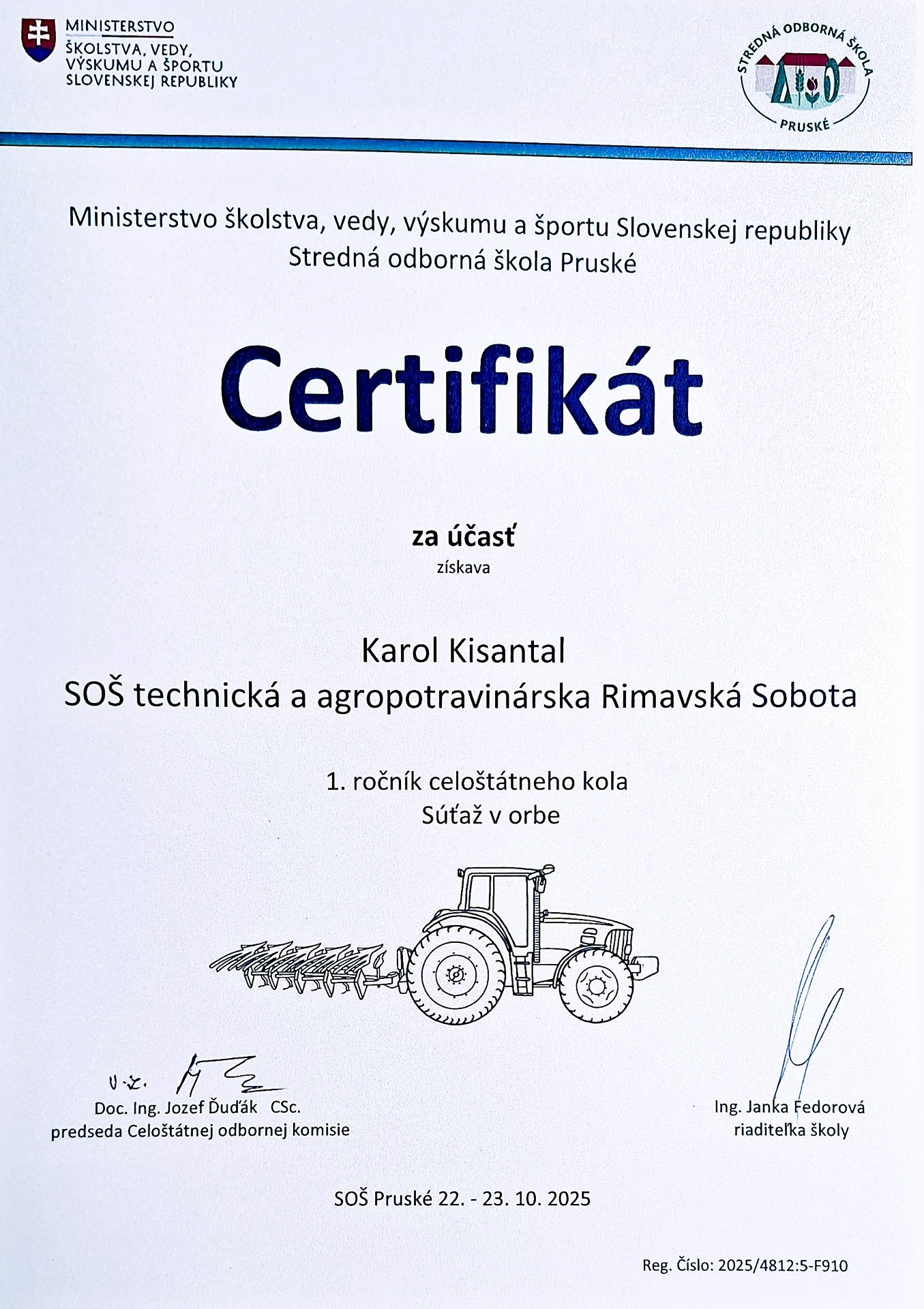 V Pruskom sa v dňoch 22. – 23. októbra 2025 konal 1. ročník celoštátnej súťaže v orbe, ktorého cieľom bolo podporiť záujem žiakov o poľnohospodárstvo, prácu s pôdou a moderné agrotechnické postupy. Podujatie organizovala Stredná odborná škola Pruské v spolupráci so spoločnosťou AgroDulov s.r.o. a združením AGRION. Našu školu SOŠ technickú a agropotravinársku reprezentoval Karol Kisantal, žiak 4. ročníka odboru agromechatronik. Súťaž odštartovala teoretickým testom, ktorý bol zameraný na problematiku orby. Po ňom nasledoval oficiálny tréning orby na pozemkoch AgroDulov, Druhý deň 1. ročníka celoštátnej súťaže v orbe, ktorý sa konal v areáli SOŠ Pruské a na súťažných pozemkoch AgroDulov, priniesol nielen napätie, vôňu pôdy a zvuk traktorov, ale aj radosť a úspech pre našu školu. Karol Kisantal získal nádherné druhé miesto v silnej konkurencii súťažiacich zo Slovenska aj z Českej republiky! Súťažný deň sa začal slávnostným sľubom oráčov a rozhodcov, po ktorom nasledovala ostrá súťažná orba. Účastníci predviedli svoje zručnosti v práci s dvojradličným pluhom, precíznosť, presnosť a cit pre pôdu, ktoré sú pre kvalitnú orbu nevyhnutné. Rozhodcovia hodnotili výkony podľa medzinárodného bodovacieho systému používaného na majstrovstvách sveta v orbe, takže posudzovanie bolo prísne. Poobede prebehlo vyhlásenie výsledkov a odovzdanie cien, kde si výhercovia prevzali poháre, diplomy, vecné aj finančné ceny. Na všetkých účastníkov čakala aj milá pozornosť – certifikáty za účasť, ktoré im budú pripomínať túto výnimočnú skúsenosť. Celú atmosféru sprevádzala radosť, uznanie a zaslúžený potlesk pre všetkých súťažiacich. Veľká vďaka patrí organizátorom súťaže – Strednej odbornej škole Pruské, pretože pripravili podujatie na vysokej úrovni. Vďaka nim sme získali cenné skúsenosti, nové poznatky aj množstvo príjemných zážitkov. Karolovi srdečne blahoželáme k výbornému výsledku a ďakujeme mu za vzornú reprezentáciu našej školy. Svojím prístupom, zručnosťou a pokojom za volantom traktora potvrdil, že poctivá práca a záujem o odbor prinášajú skvelé výsledky.