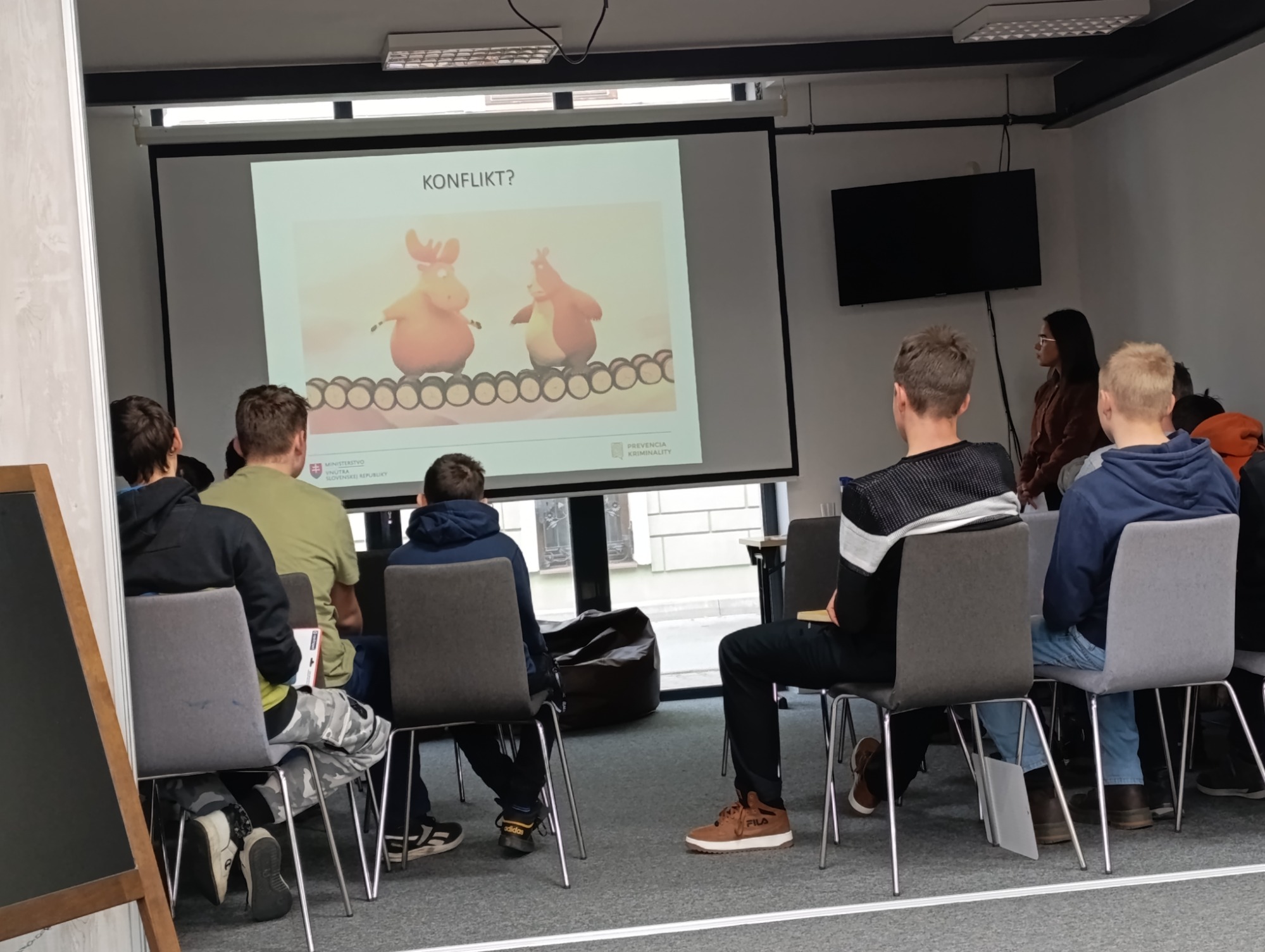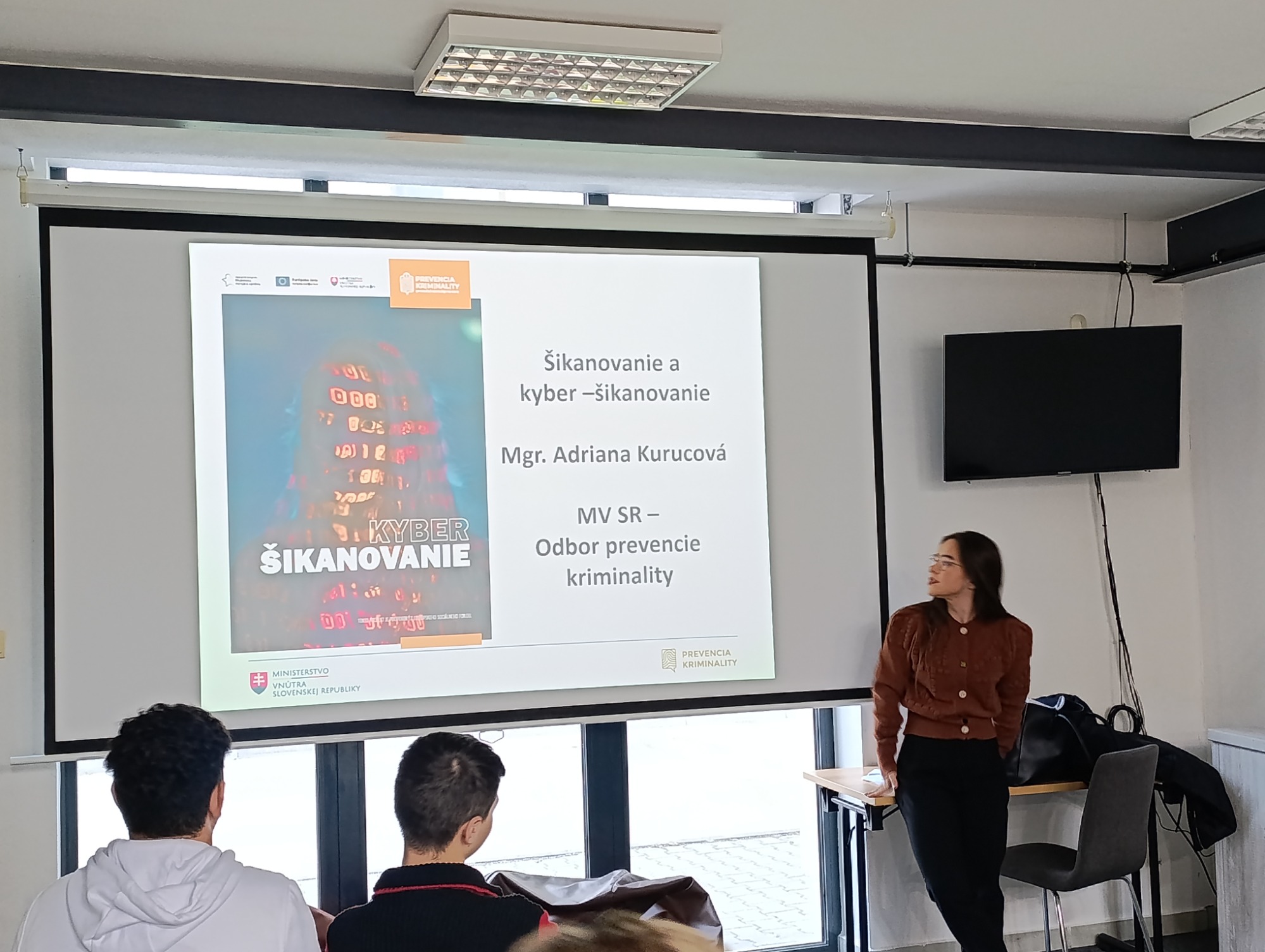 Na začiatok týždňa si žiaci 1.R a 1.S vypočuli zaujímavú prednášku o šikane a kyberšikane, ktorá bola realizovaná Centrom práce s mládežou – SPACE a Ministerstvom vnútra – odborom prevencie kriminality. Prednášku viedla Mgr. Adriana Kurucová, ktorá so žiakmi viedla diskusiu, poukázala na základné znaky šikany a upozornila na chyby v bežnom živote, ktoré môžu viesť k následnej šikane, aj v online priestore. Prednášku na túto tému absolvovali aj žiaci 1.C triedy. Túto prednášku organizovala Knižnica Mateja Hrebendu v spolupráci s Centrom poradenstva a prevencie.